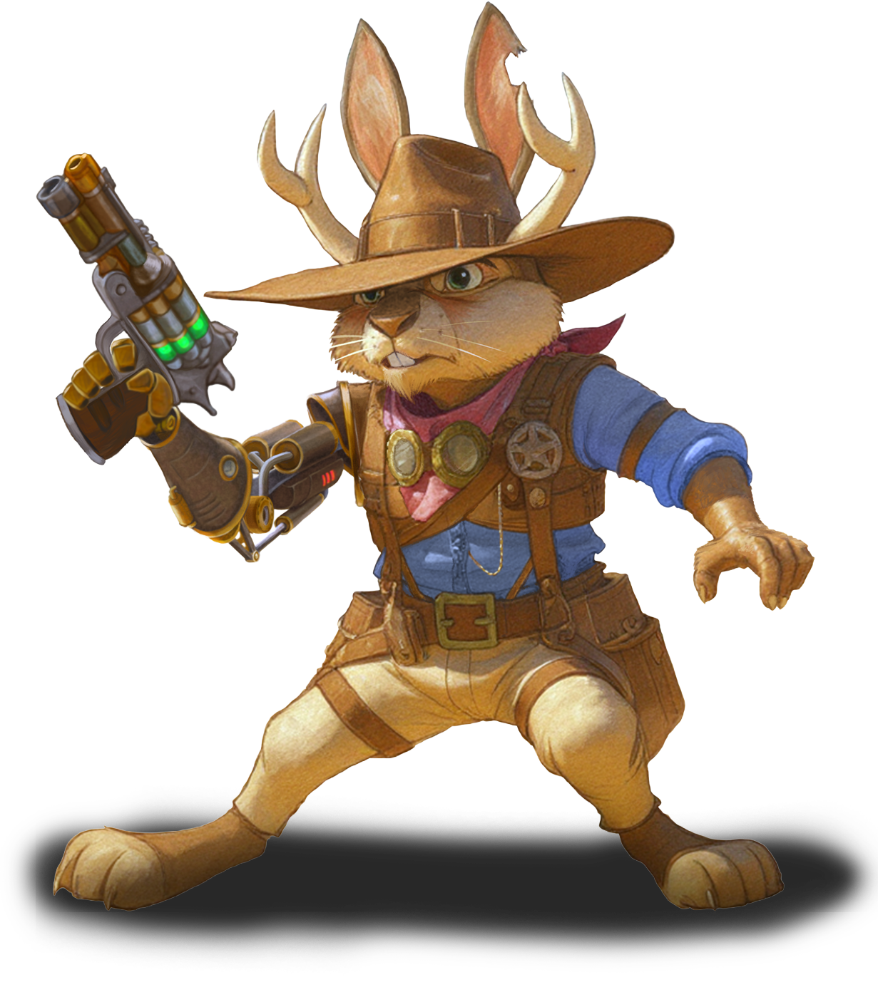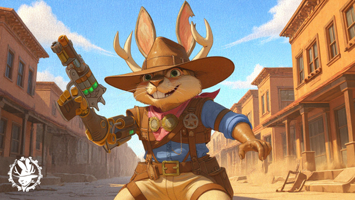 Jackalope Junction is a small western town where if’n Zane Gray and Jules Verne had any influence, this would be it. Located in the valley of the Mighty Oak, known to us here as “Oak Grove” but to the residents and those traveling through, “Mighty Oak Valley” is the common reference (and at one time, home to Mighty Oak Springs, a once sprawling and wealthy mining town in the mid-1800’s). Jackalope Junction ain’t like any other town you’ve ever encountered or visited (not yet at least!), populated by robots, people, half-machine/half-biological gunslingers known as “Clankers”, and human-like animals, with the most notable being the town Sheriff, Jim Cleghorn, aka “Jackalope Jim”, ‘cuz he’s a six-foot tall Jackalope (half jackrabbit, half antelope); and his Deputies and allies known far and wide as the “Junctioneers”.